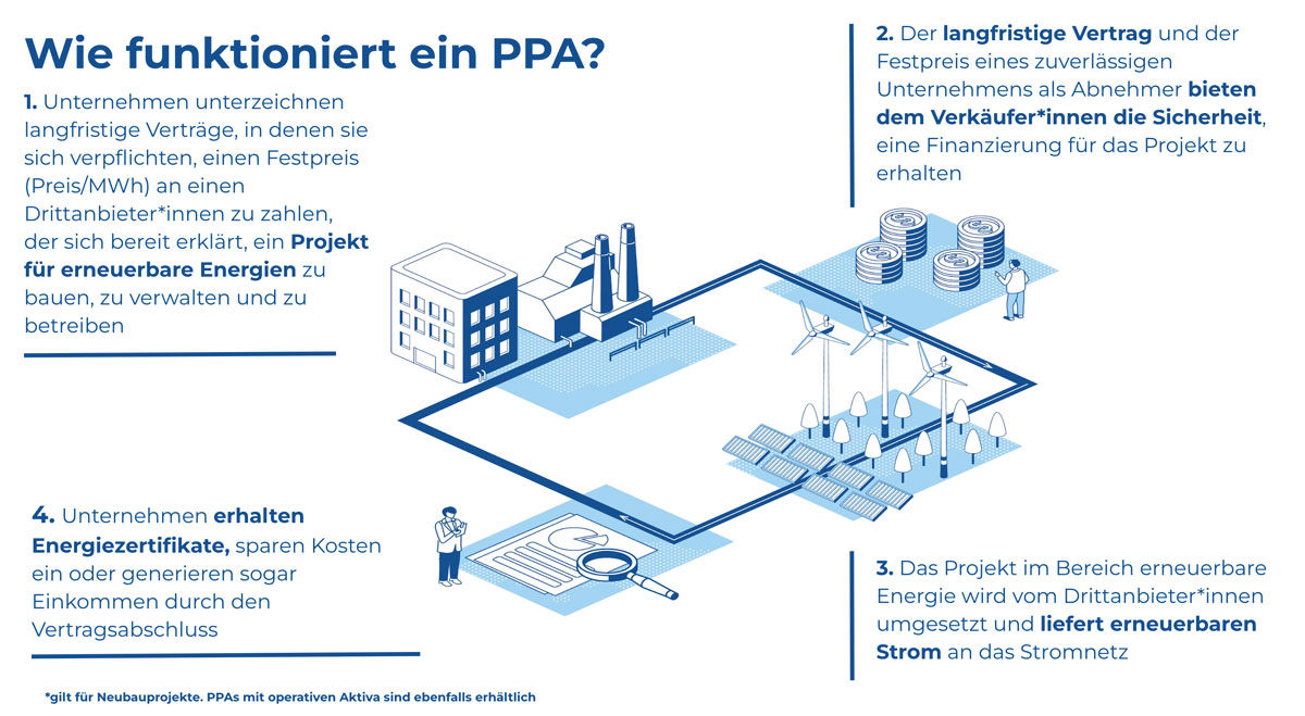 PPAs ermöglichen es Unternehmen, ihre Ziele für erneuerbare Energien in einem großem Umfang zu erreichen, Kosteneinsparungen zu erzielen und langfristige Energiepreisrisiken zu steuern.