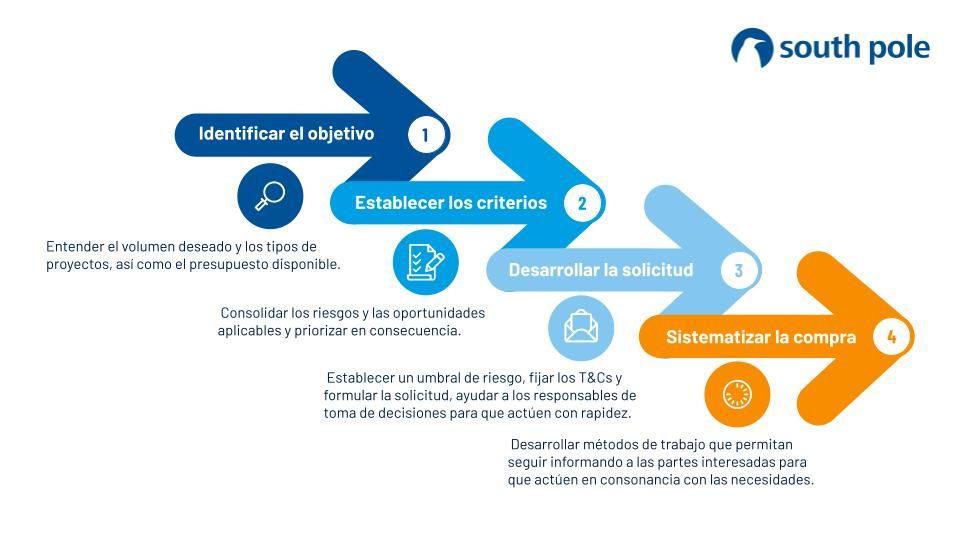 Con el fin de actuar con rapidez en un mercado en el que los créditos se suelen comprar rápidamente, South Pole recomienda evitar los largos procesos de solicitud de propuestas y, en su lugar, establecer los términos y condiciones por adelantado y estructurar la solicitud de forma que se pueda decidir fácilmente si se acepta o no, a fin de garantizar los créditos en un mercado competitivo. Dependiendo de cómo enfoque una entidad sus compras de créditos de carbono, puede plantearse preguntar al propio proveedor si su petición es razonable en función de las condiciones actuales del mercado. Al final, es más eficiente tanto para el proveedor de créditos como para el comprador corregir el rumbo desde el principio y ayudar al comprador a comprender mejor el mercado.